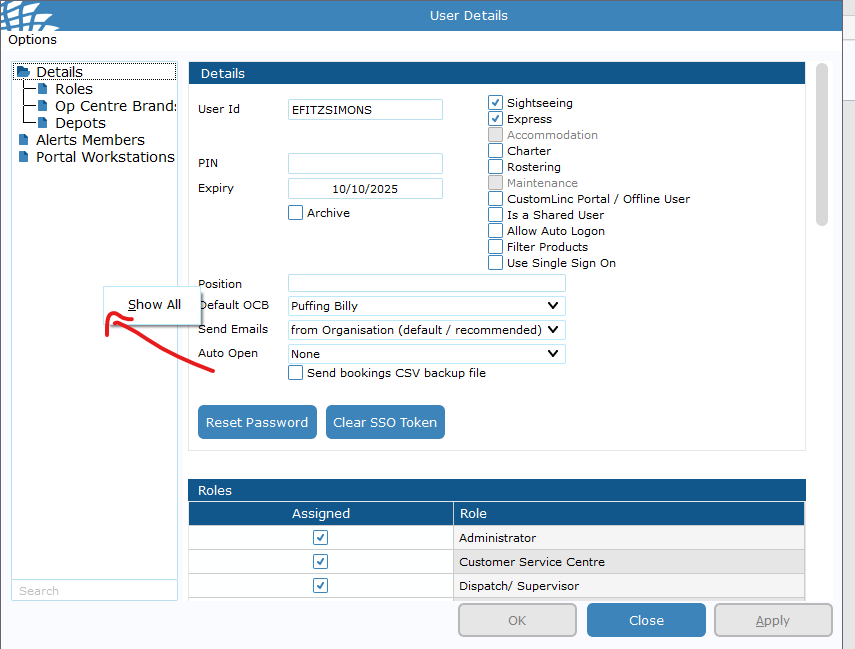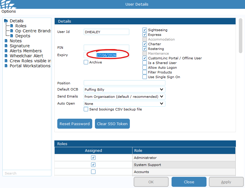For users with a generic password such as SM's or Booking Clerks using RFID, you will also need to remove the Password Expiry.