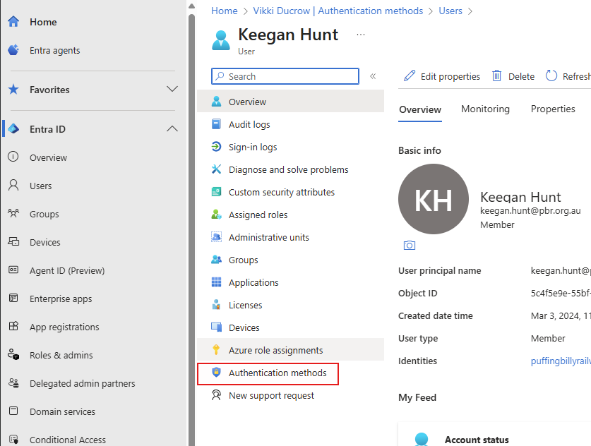 - In Entra, head to "Users", select the user and select "Authentication Methods".
