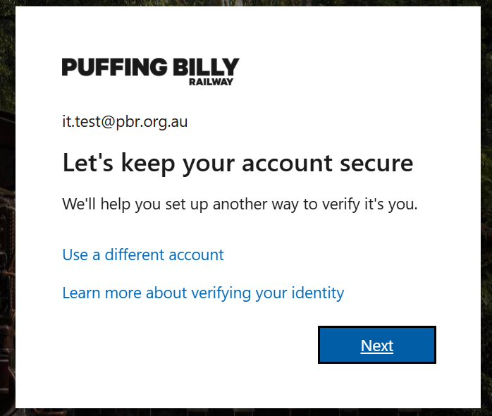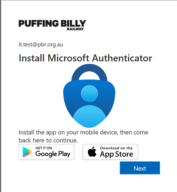 - The below screen will appear, install the Microsoft Authenticator app on your mobile device. Once done, click next.