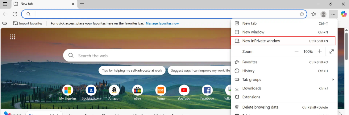 - Open your browser (edge or chrome) and open an "InPrivate window". On chrome it is the same spot but called "incognito".