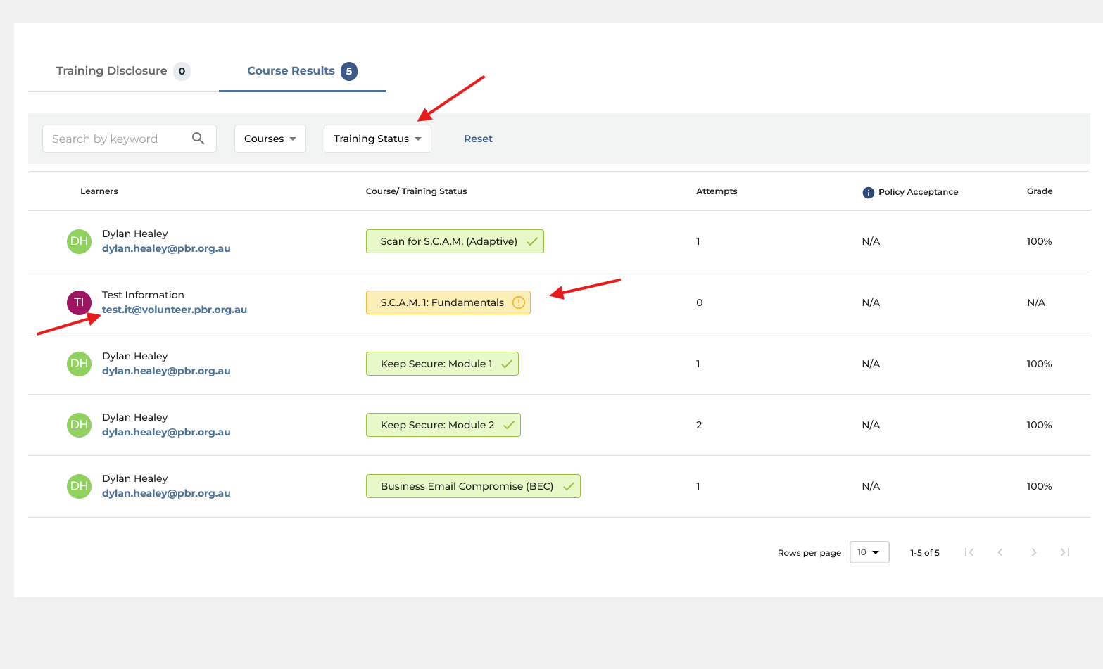 Here you can see the user, their complete or incomplete status on specific modules. You can also filter by person' name, or training status (complete, failed, incomplete so on).