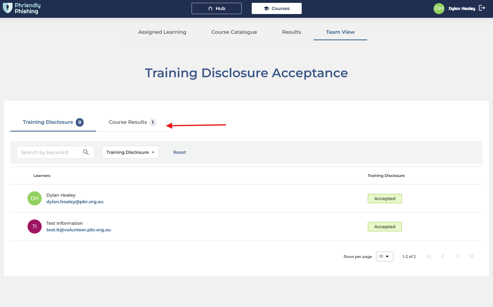 To see your teams current complete or incomplete training click on Course Results