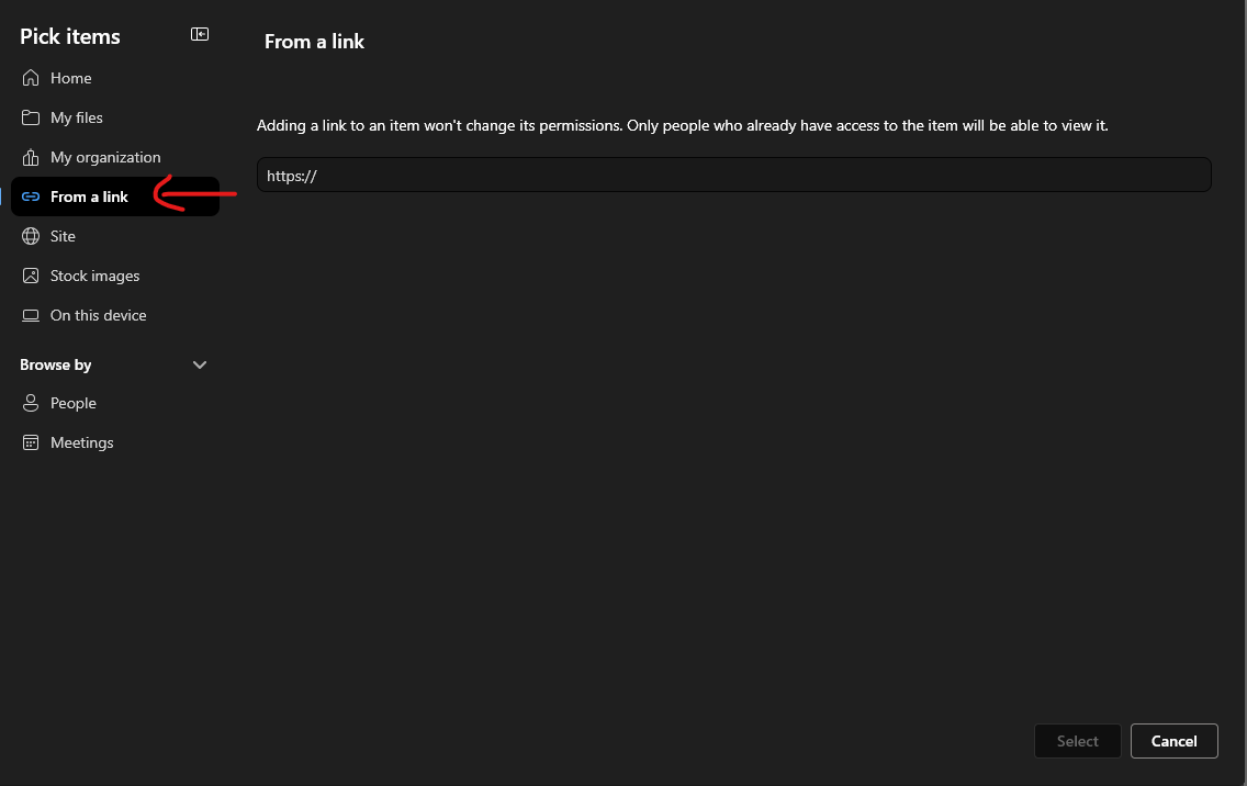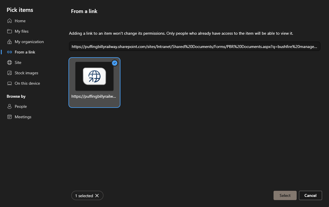 - Paste the webpage link to the site/document, make sure the tile is selected and hit Select in the bottom right.