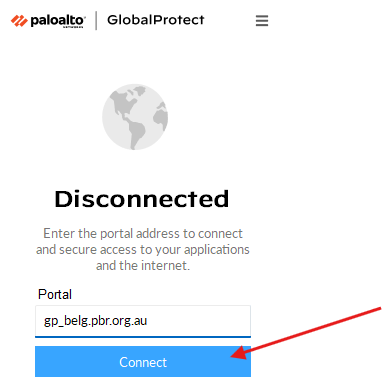 The first time opening the program you will receive a window that has a clickable "Get Started" option, click this and it will bring you to the Connect page. - Click connect, and wait for a Microsoft Authentication window. The portal address should be automatically configured, otherwise please input gp_belg.pbr.org.au then click connect.
